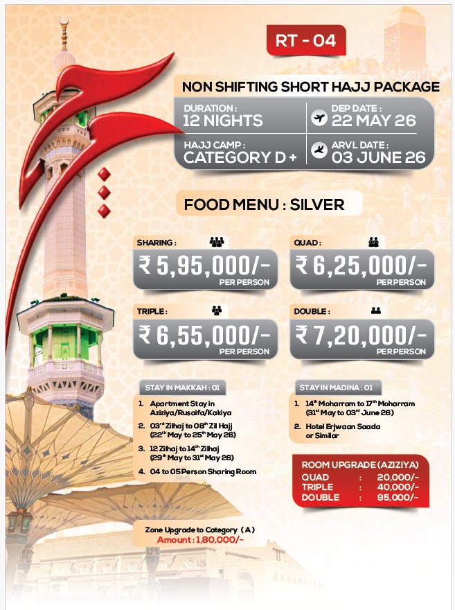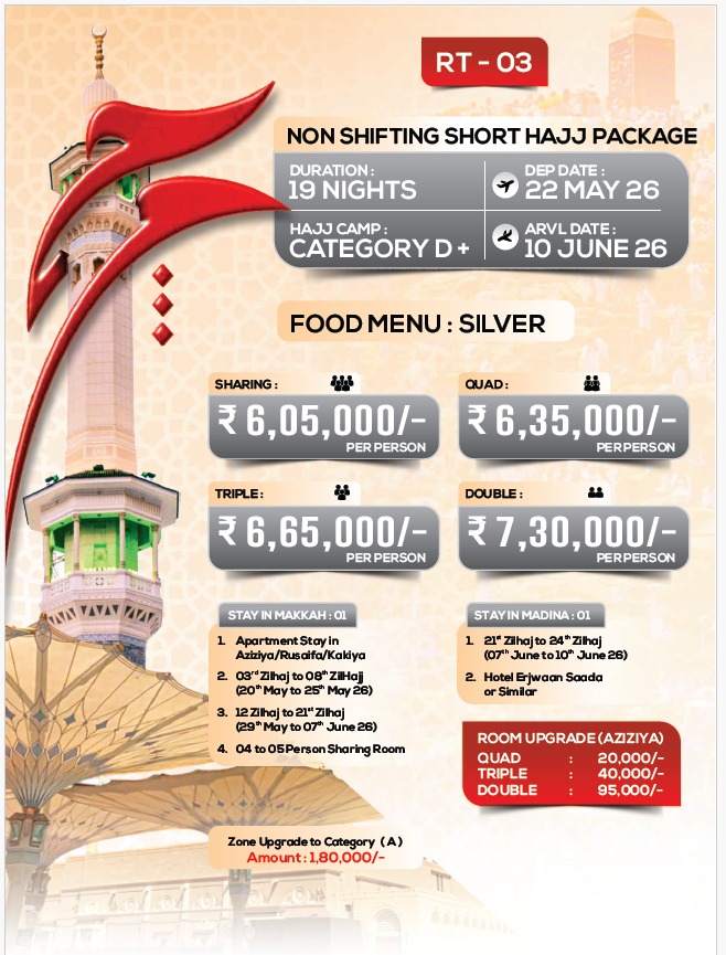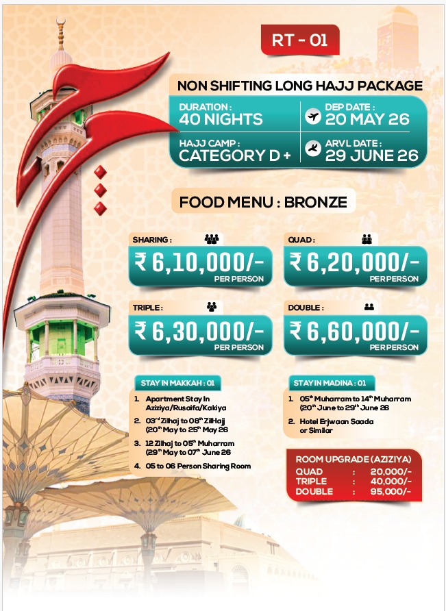 Bookings and detailed pricing for Hajj 2026 have been started you can Enquire Now Rahat Umrah for Hajj 2026 Packages. We highly recommend you contact us now at +91 80-9773-4658 to register your interest. This will give you access to early bird discounts and priority booking once the packages are released.